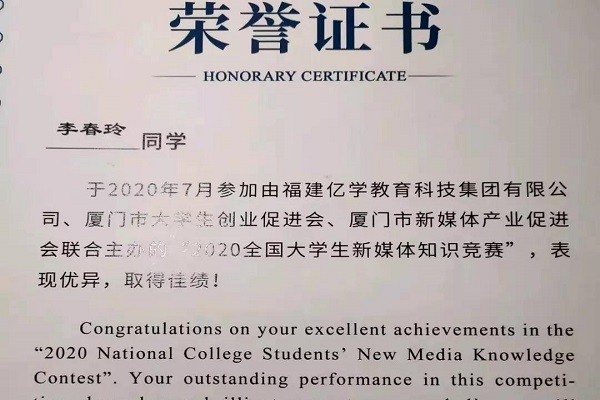 她勤奋刻苦,广泛学习。她成绩较好,对学习始终保持高度的热情,课上认真学习专业知识,课下及时巩固;课余时间会去图书馆学习。不仅仅满足于课本知识,还会积极去学习课外知识,学习书法绘画,尤克里里,充分发展自己的兴趣爱好。积极参加学校活动,锻炼自己,已通过英语四六级考试,普通话考试,曾获2次国家励志奖学金,获“星空(xingkong)体育官方网站优秀宣传大使”称号。积极参加各项比赛,获“大学生新媒体知识竞赛”一等奖,“中外文学常识知识竞赛”一等奖。
