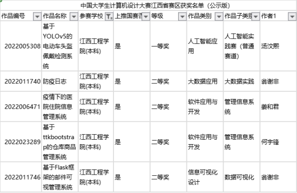2022年5月8日,一年一度的中国大学生计算机设计大赛江西省赛落下了帷幕,经过为期一周的评审,我校优秀学子汤汶熙团队的作品荣获江西省赛区一等奖,翁谢非、姜和君、何宇峰的作品荣获全省二等奖,详细获奖情况如下表所示。
