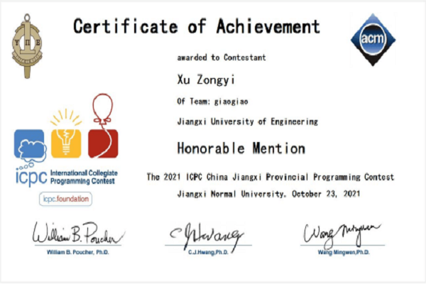 学院重视“以赛促学”。学生获得“蓝桥杯”全国赛二等奖2人次、全国赛三等奖1人次,全国优秀奖3人次,江西省赛一等奖6人次、二等奖10人次,三等奖15人次。第四届传智杯全国大学生程序设计赛二等奖2人、优秀奖2人。ACM-ICPC 2021大学生程序设计赛中团队荣获Honorable Mentions奖。江西省信息技术知识赛一等奖9人次,三等奖1人次。第二届“网鼎杯”网络安全大赛,我院“区块链”代表队获得93个积分,进入高校组前20名。
