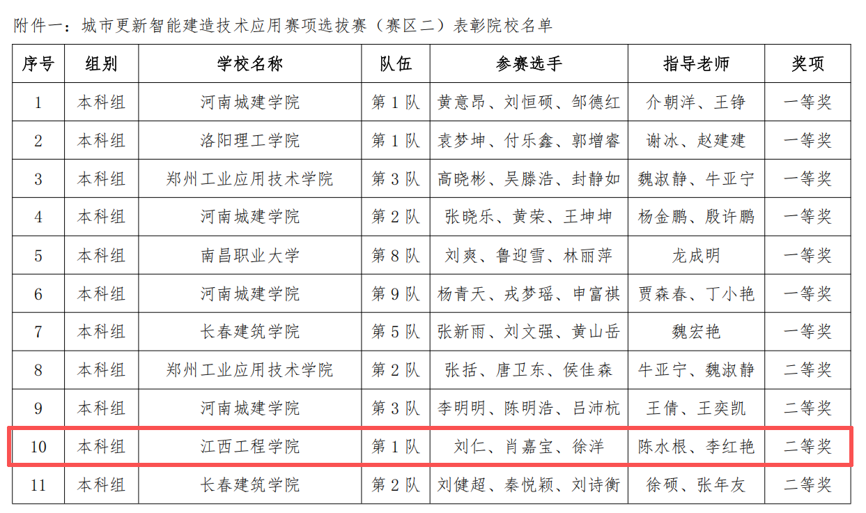 近日,2025一带一路暨金砖国家技能发展与技术创新大赛—城市更新智能建造技术应用赛项区域选拨赛通过线上竞赛的方式成功举办,本次竞赛由金砖国家工商理事会中方理事会、一带一路暨金砖国家技能发展国际联盟、“一带一路”暨金砖国家技能发展与技术创新培训中心主办,中国发明协会、教育部中外人文交流中心联合主办,金砖国家工商理事会技能发展、应用技术与创新中方工作组承办,此次参赛由我校智能制造与建造学院陈水根、李红艳老师指导,23级工程造价专业刘仁、徐洋与23级土木工程专业肖嘉宝三名同学组成的代表队参加,最终荣获二赛区二等奖,成功跻身全国总决赛。