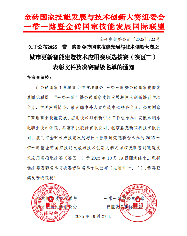 该赛事深度响应金砖国家系列宣言及我国职业教育、智能建造相关政策要求,聚焦金砖国家与“一带一路”沿线国家在建筑智能化技能发展与技术创新合作。赛事规模盛大,吸引全国数百所高职院校相关专业的精英团队参与,覆盖智能施工系统开发、智能监测数据分析、建筑机器人算法应用等多个赛道,全方位考察“人工智能+建筑施工”的技术实践与创新能力。在激烈的竞争中,智能制造与建造学院代表队凭借前沿的技术方案和扎实的实践能力脱颖而出,为学校赢得了荣誉。