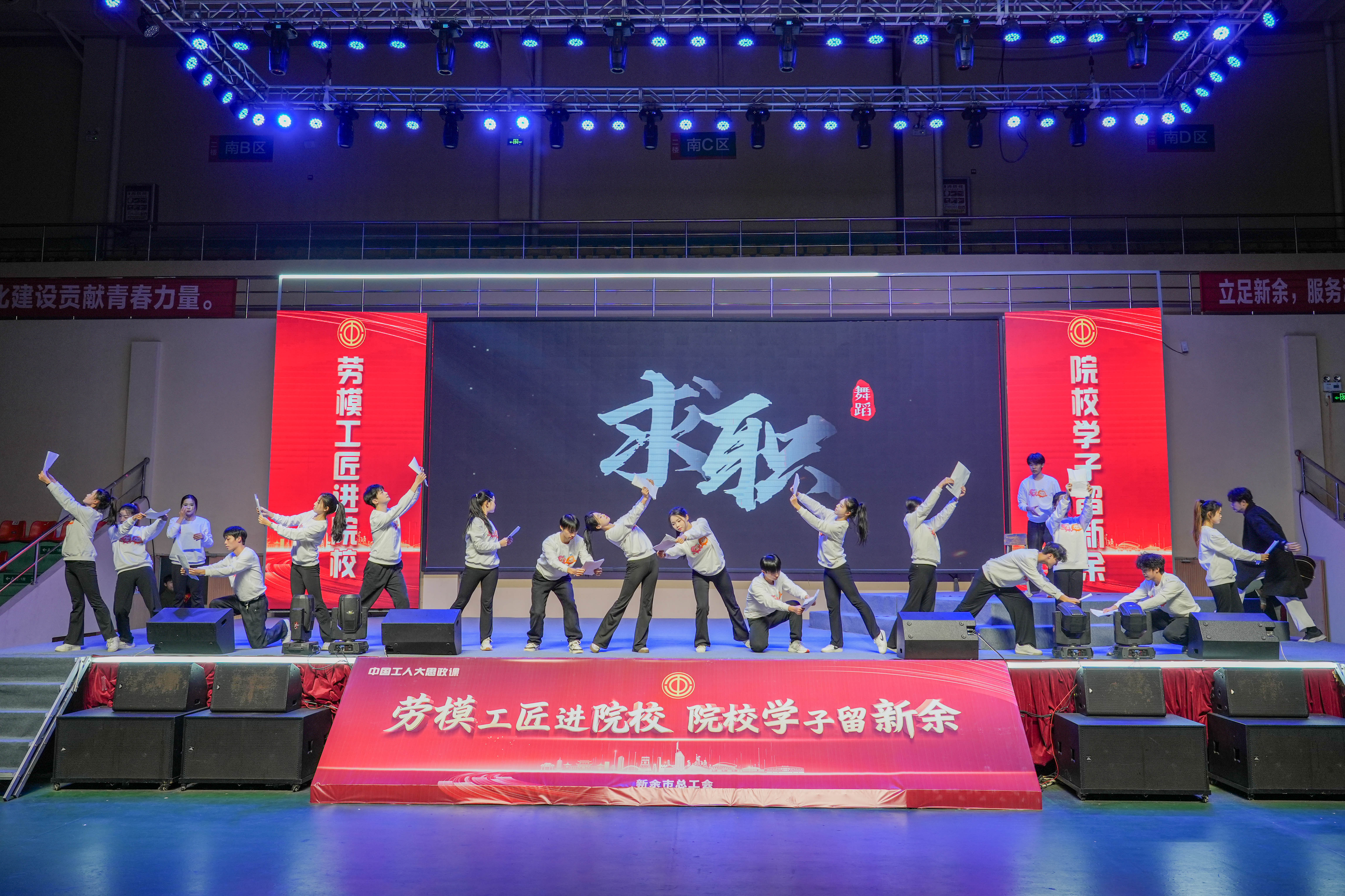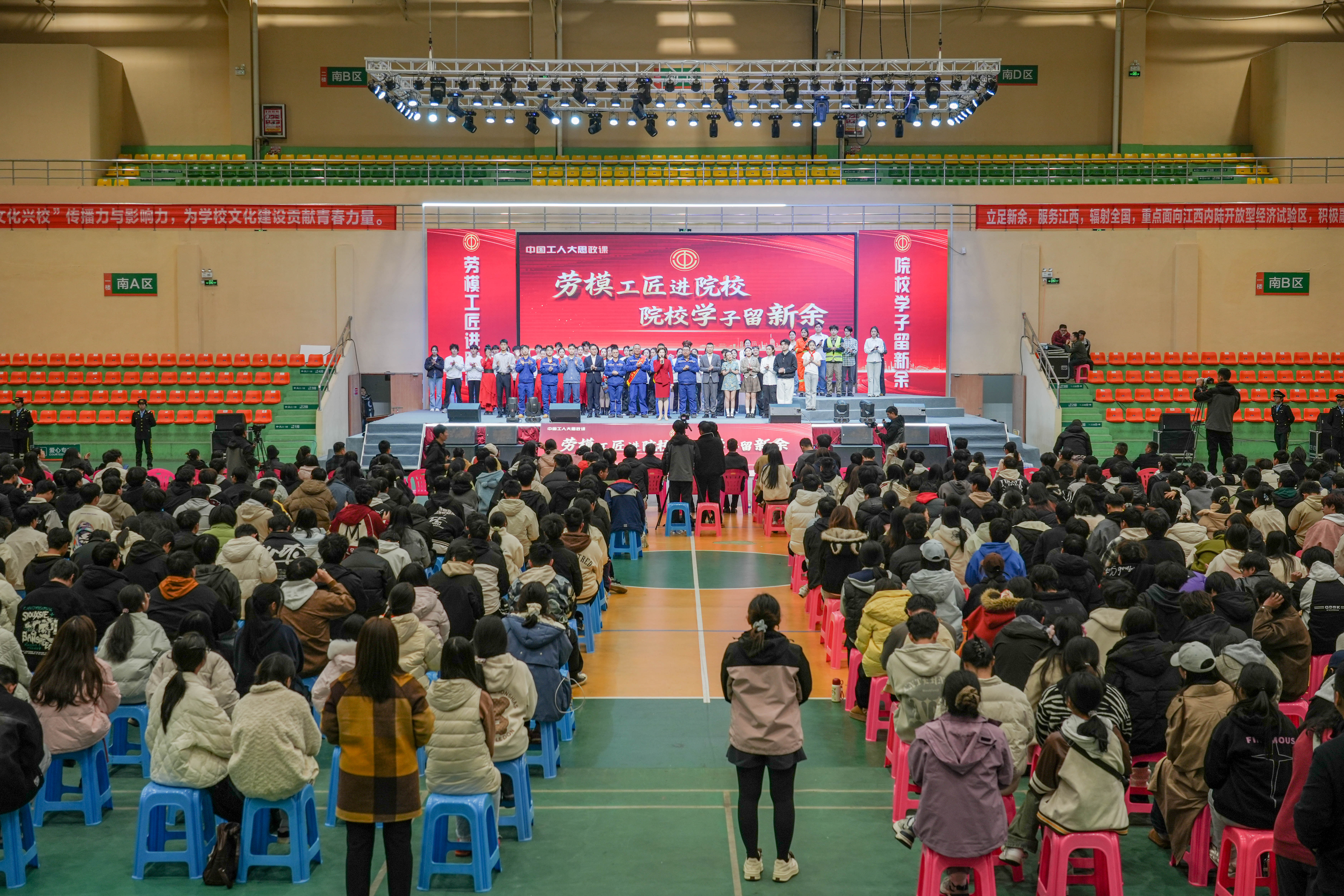 11月27日晚,一堂以“劳模工匠进院校 院校学子留新余”为主题“大思政课”在学校体育馆盛大举行。校党委书记、督导专员魏建克,新余市总工会党组书记、常务副主席胡春华,校党委委员、理事长助理、校长助理乐俊杰,马克思主义学直属党支部书记于永清、马克思主义学院院长王勇、工会主席刘志英等领导出席活动。劳模代表及院校师生近1000人共同参与了这场思政盛宴。