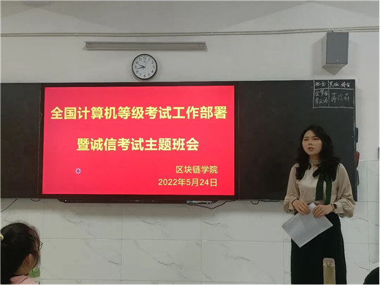 为迎接全国计算机等级考试,并严肃考风, 端正学风,增强学生们的诚信意识,营造文明、诚信考试的氛围。5月24日,区块链学院组织各班级召开全国计算机等级考试工作部署暨诚信考试主题班会。会议由辅导员主持。