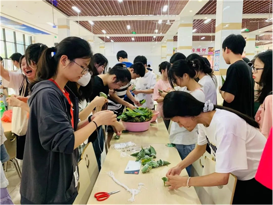 活动现场,淳淳的糯米香、棕香沁入心脾。一下课,师生们纷纷来到仙膳堂展开了其乐融融地包粽子活动。有经验的老师包地游刃有余,有棱有角,而第一次尝试包粽子的同学们屡屡出现漏米、包住这头,裹不住那头等情况,但在老师和饭堂工作人员的帮助下,同学们学会了拿捏粽叶的手法和捆绑稻草绳的方法,渐渐地一个个有模有样的家乡粽子陆续诞生了。从无到有,从匆忙到从容,学生们包得越来越得心应手,脸上也不由得露出藏不住的笑容和自豪。“纸上得来终觉浅,绝知此事要躬行。”