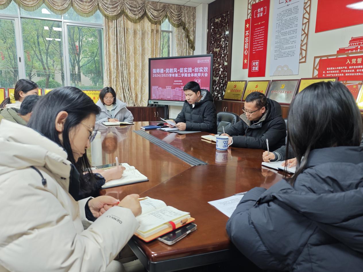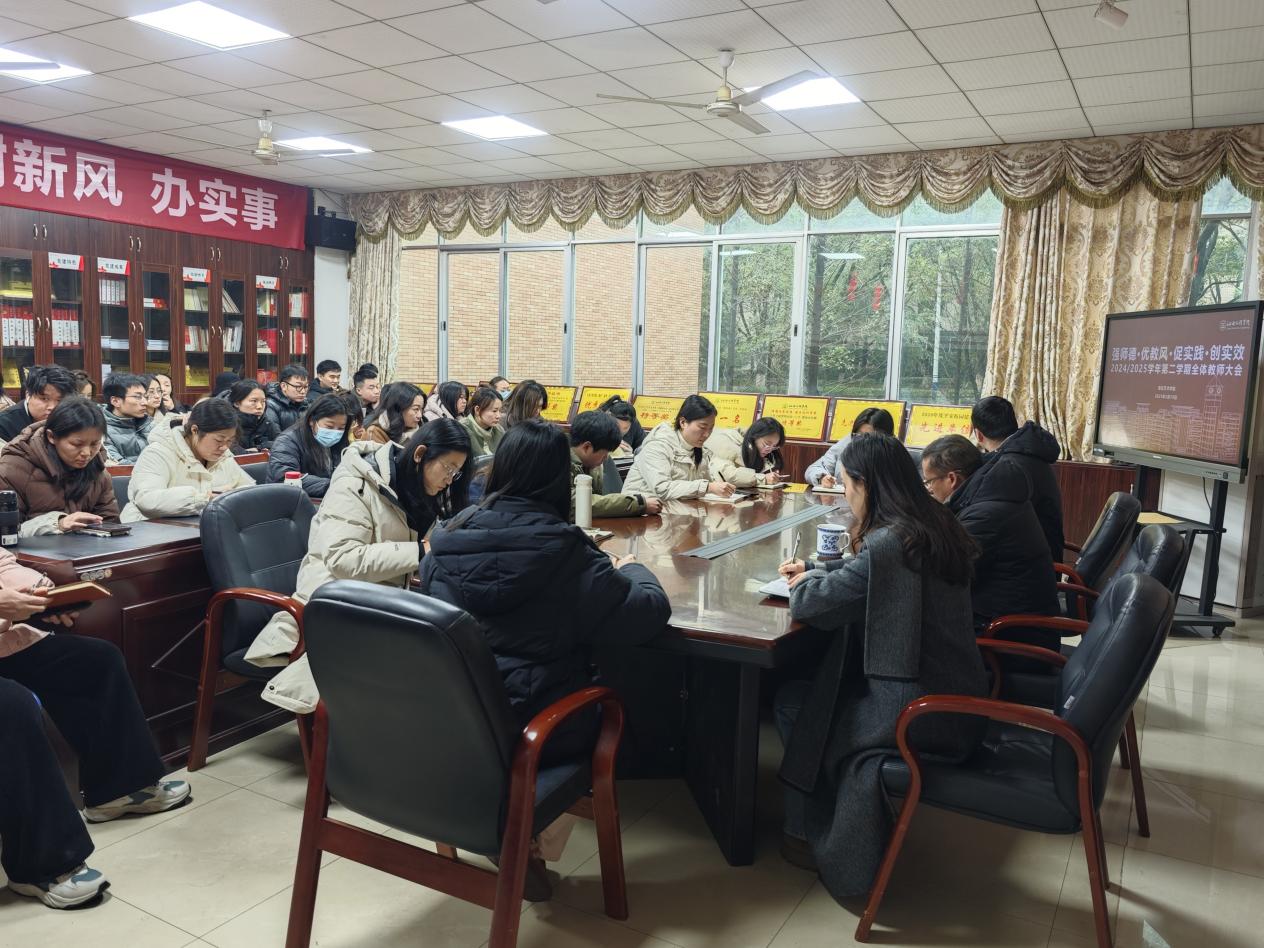 2025年2月19日下午2时,抱石艺术学院在艺术楼202会议室成功召开了2024-2025学年第二学期全体教师大会。此次大会的主题为“强师德、优教风、促实践、创实效”,旨在共同探讨新学期教育教学工作的新思路和新方法。