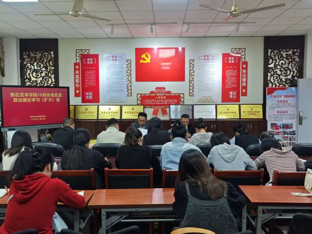 10月29日下午,抱石艺术学院党总支在艺术楼202党员活动室召开10月份政治理论学习(扩大)会议,会议以“深入学习党的二十届四中全会精神聚焦“十五五”规划以党建引领本科教学工作评估提质增效推动学校平安有序发展”为主题。学院党总支书记刘永东主持会议,抱石艺术学院院长张志胜、副院长王冬冬、各教研室主任、各支部委员及全体教师党员出席会议。