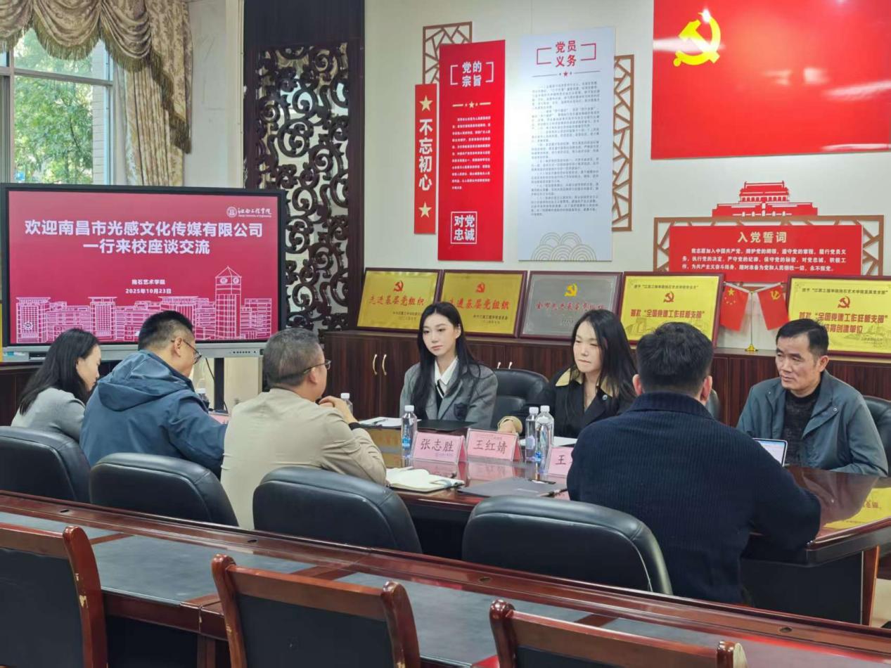 为深化校企合作内涵,精准对接艺术产业人才需求,探索产教融合育人新模式,2025年10月23日,南昌光感文化有限公司一行莅临抱石艺术学院开展交流座谈。抱石艺术学院院长张志胜、党总支书记刘永东、副院长王冬冬以及教研室主任参加座谈,双方围绕人才培养、实践教学、项目合作等核心议题展开深入探讨。