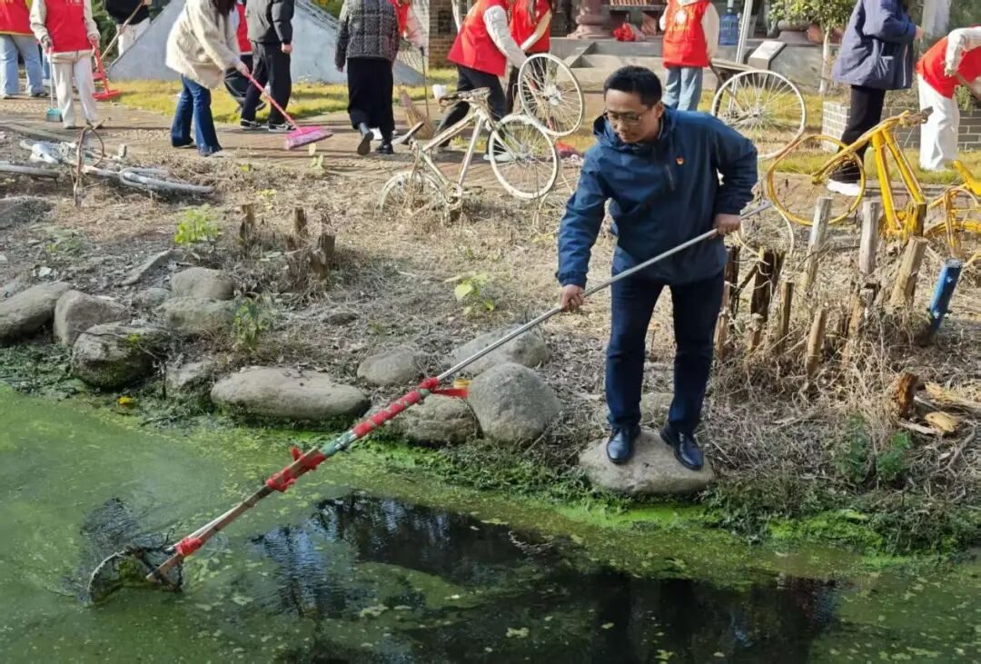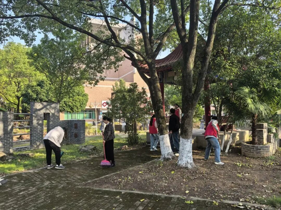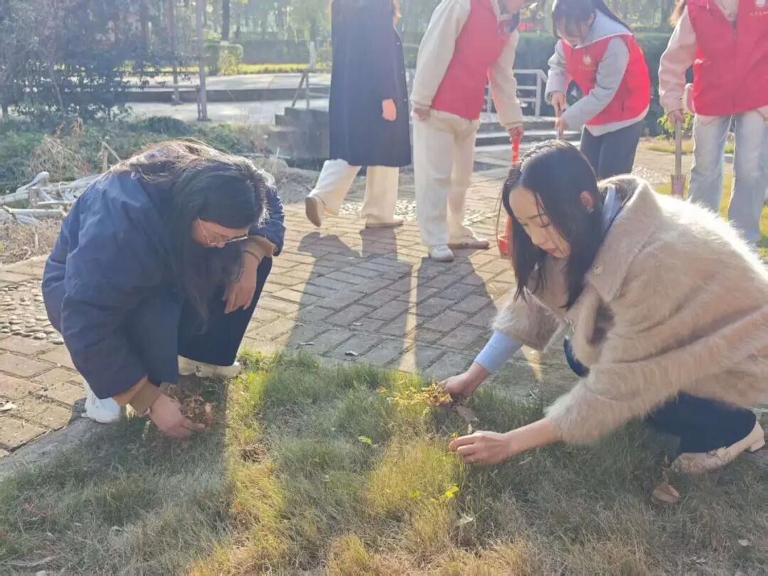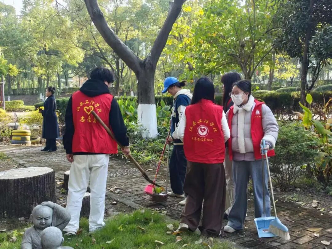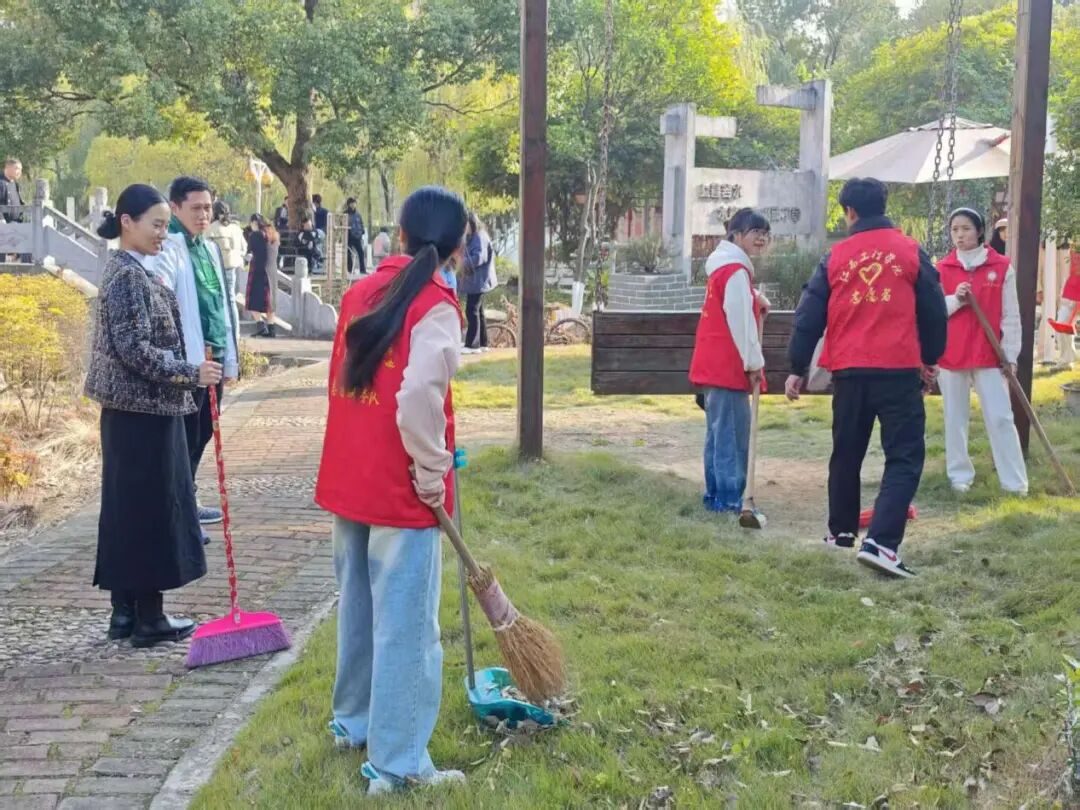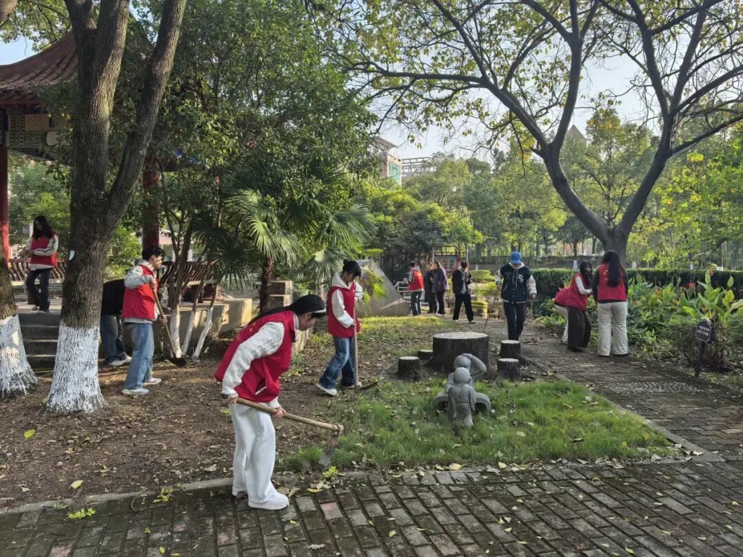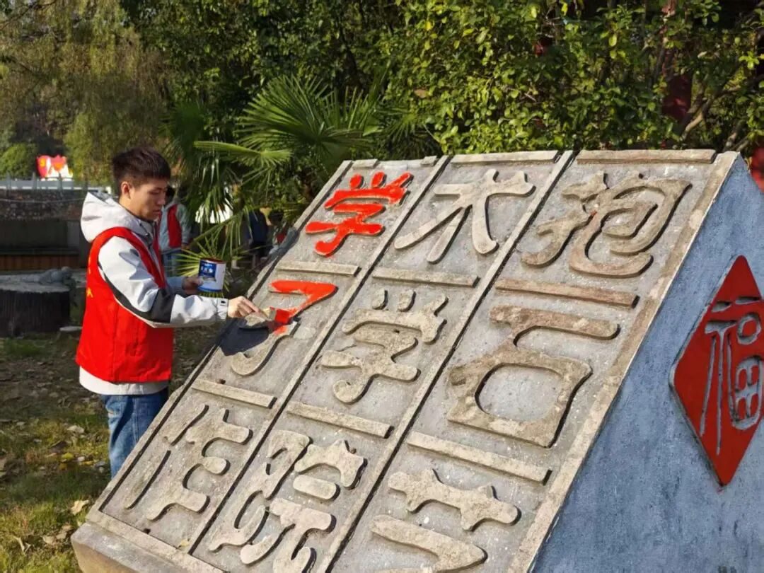 党员师生们身着统一红色志愿马甲,佩戴党员徽章与志愿标识,迅速按照分组投入清扫工作。大家分工协作,志愿者们手持扫帚清扫落叶杂物,用清洁剂清除墙面污渍,对小溪道整理清洁,对修复损坏的设施以及三角石头的文字刷漆等卫生死角进行彻底清理。