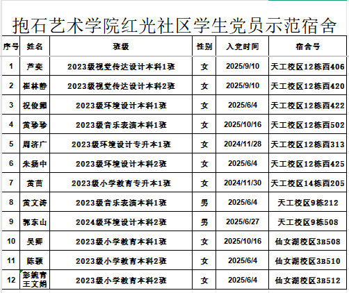 2025年12月9日晚上6:30,抱石艺术学院在学院202党员会议室举行党建引领·星光闪耀——“红光社区”党员示范宿舍授牌仪式。党总支书记刘永东、党总支副书记姬赛赛、专职组织员叶丽、团总支书记答惠琳、全体辅导员以及首批获批“党员示范宿舍”的全体成员、各宿舍学生党员和入党积极分子代表共同参加了仪式,活动由答慧琳主持。