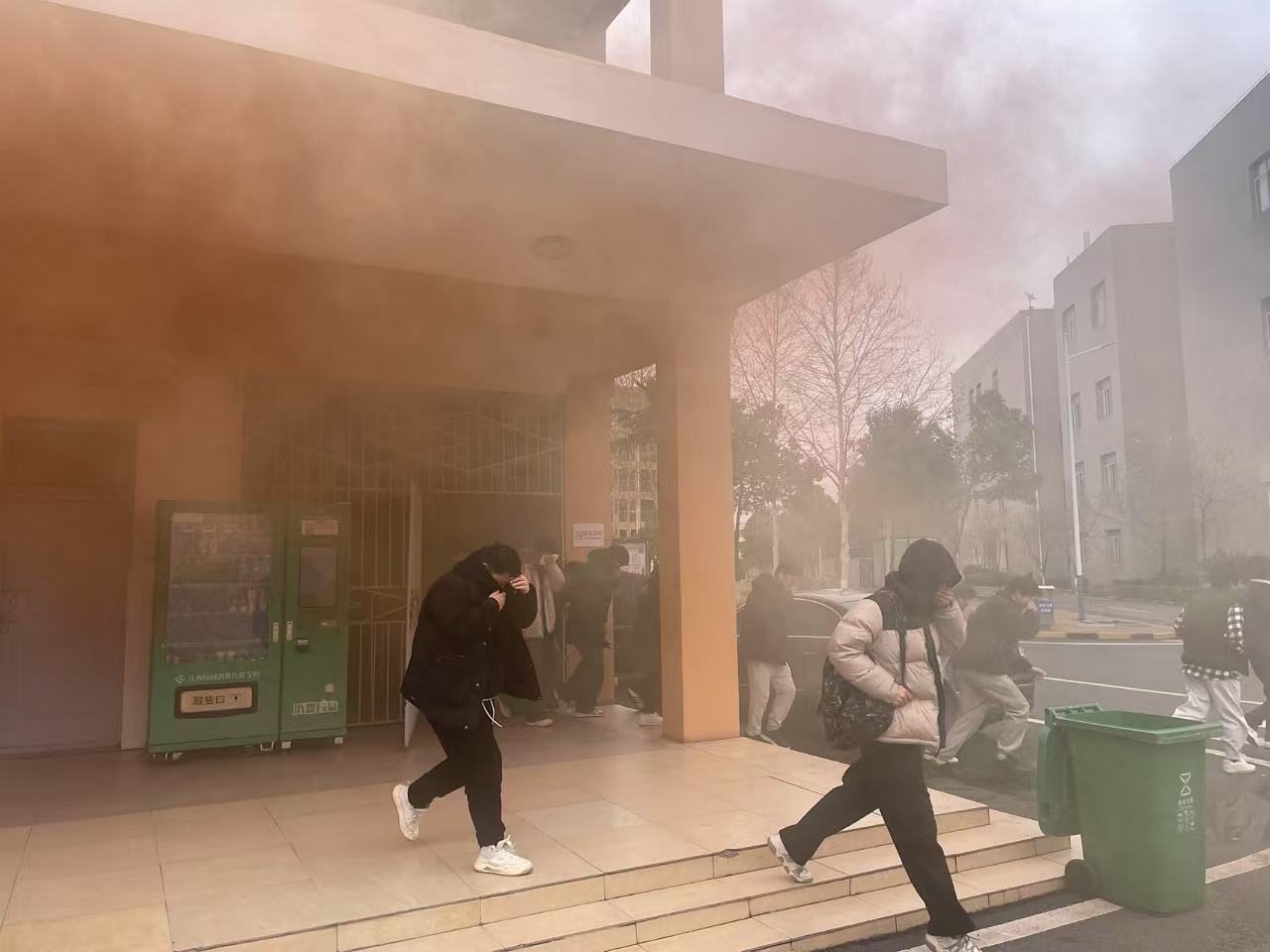 下午4时,教学楼内师生正沉浸于课堂学习,随着走廊内烟雾弹骤然燃放,刺耳的消防警报声瞬间响彻校园。得到警情后党委委员、校长助理邹建民立即向校党委书记、督导专员魏建克报告,魏建克要求立即启动应急预案,组织疏散与救援。应急指挥组、灭火扑救组、逃生疏散组、医疗救护组、后勤保障组、通讯联络组立即响应应急预案,赶往现场。与此同时,各班级师生迅速反应,在任课教师的引导下弯腰捂鼻,沿逃生路线有序撤离。各二级学院教职工同步就位,确保疏散通道畅通。短短几分钟内,上课师生全部安全抵达操场集合点,过程紧张有序,未发生推挤踩踏现象。