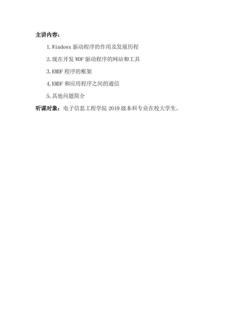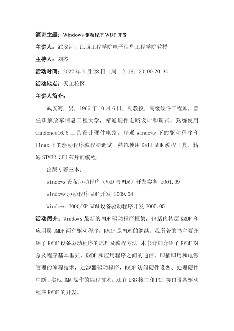 【学术通知】电子信息工程学院教授武安河学术讲座:Windows驱动程序WDF开发