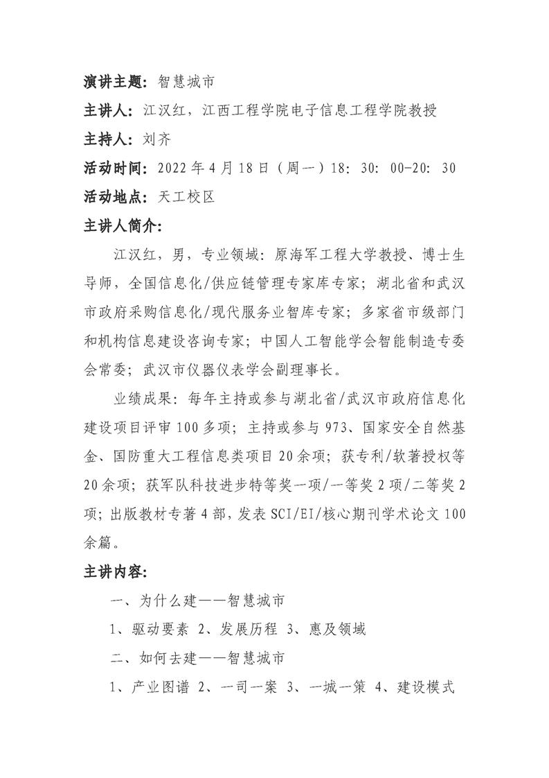 【学术通知】电子信息工程学院教授江汉红学术讲座:智慧城市