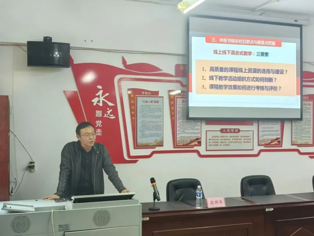 会上,简辉华教授的讲解深入浅出,条理清晰,逻辑严密。他先是讲述了五类一流课程申报的政策背景,提出了一流课程中的线下课程和混合式课程建设的问题导向思维。随后,他对国家一流课程申报突出问题进行了分析,他建议教师要根据学院办学定位和人才培养目标,建设适应我院人才培养需要的一流课程,并体现出学院的特色。同时,要充分认识开展校企合作一流本科课程建设的重要意义,认真组织、提前谋划、统筹申报,通过一流课程建设来推进专业内涵建设,力争在一流课程建设方面取得突破,并由此对申报书相关栏目要点与侧重点把握进行了阐述说明。在交流过程中,他还对如何规划设计混合式教学?针对这个问题,我们进行了深刻的讲解,并指出了如何体现一流课程建设特色及差异化课程建设的方法。最后对如何做好校企合作一流课程申报进行了讲解并展示了案例,讲座取得了良好效果。