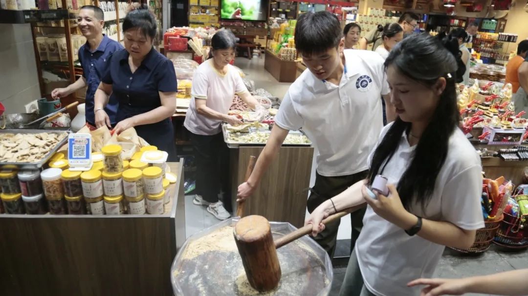 夜幕降临茨坪镇,民俗文化润心田,实践队深入茨坪特色小镇开展民俗调研。青石板街巷灯火通明,队员们沉浸式体验打糍粑、编织草鞋等非遗技艺,并进行实践操作,通过专业知识进行电商直播,把当地非遗文化与现代技术相结合。在红军剧场聆听《十送红军》经典传唱。带队教师郭远峰指出:“今晚的走访既是对红色文化的延伸体悟,更为后续乡村产业调研奠定基础——这正是‘接地气、建乡村’的生动实践。”
