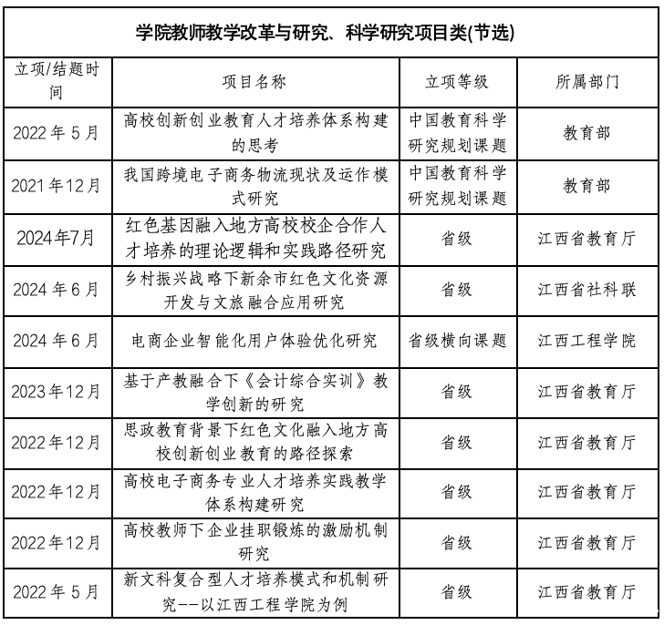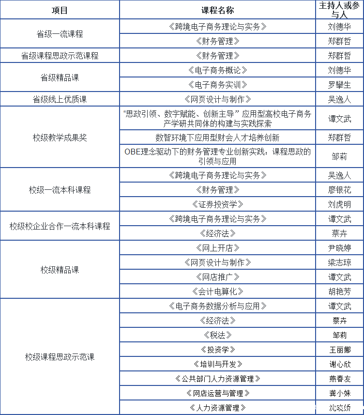 学院现有教职工92人,专任教师80人,外聘教师1人,专任教师中,“双师型”教师48人,占专任教师的比例为60%;具有高级职称的专任教师28人,占专任教师的比例为35%;具有研究生学位(硕士和博士)的专任教师72人,占专任教师的比例为90%。学院拥有“电子商务优秀教学团队”“跨境电子商务学科群一流教学团队”“电子商务数字经济科技创新团队”“金融工程优秀教学团队”“财务管理教学应用团队”等优秀教学团队、“财务管理专业”、“电子商务专业”星空(xingkong)体育官方网站一流本科专业建设点,经济管理学院教学团队在近三年来,主持国家社科课题3项,主持或参与省级课题100余项,编著教材40余部,发表论文300余篇,申请专利50余项,指导学生参加国家级、省级竞赛获得一等奖100余项。4名教师成功入选新余市数字经济人才专家库,14名教师成功入选高校科技服务人才库,助力地方经济发展。