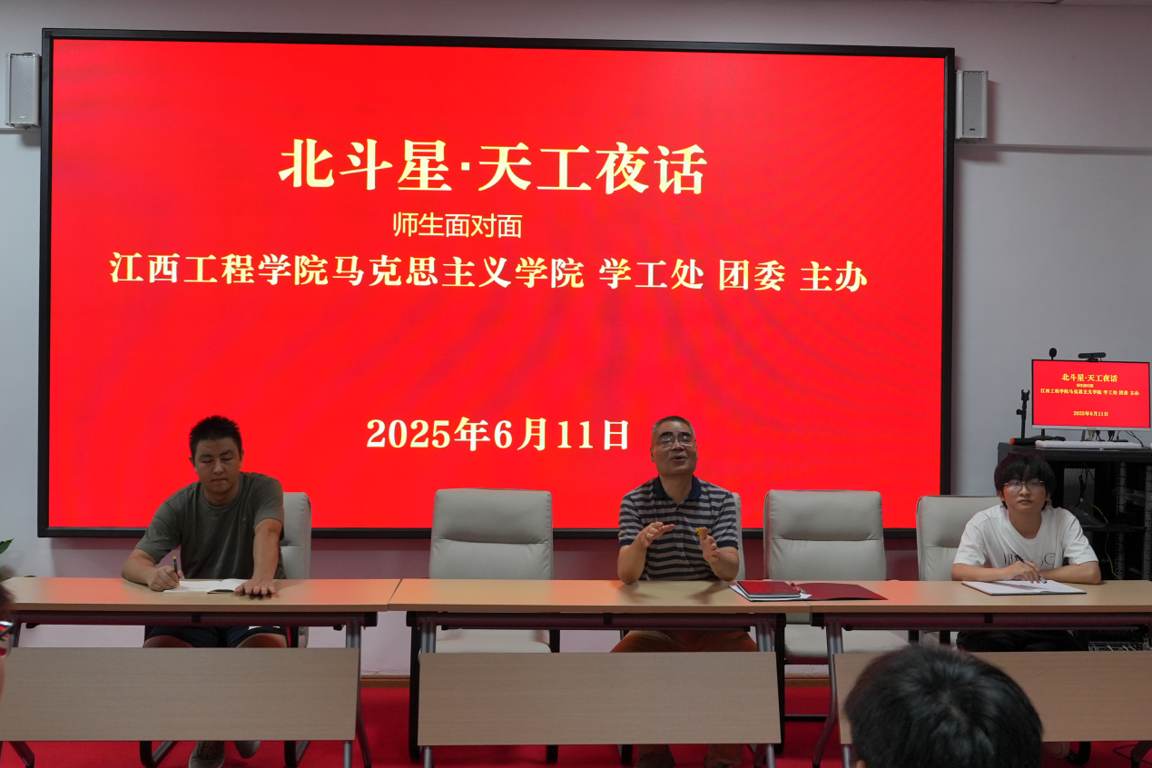 6月11日晚,“北斗星・天工夜话”——师生面对面交流活动在天工校区“一站式”学生社区服务大厅红色影院温情启幕。本次活动由马克思主义学院、学工部、团委和电子信息工程学院联合主办,马克思主义学院彭卫东教授携《探寻新时期中美正确相处之道》微党课与学生展开深度对话,后勤处、保卫处等部门负责人与学生代表齐聚一堂,构建起 “思想引领+生活服务”的双维沟通桥梁,生动诠释“北斗星・红智”党建品牌的协同育人内涵。