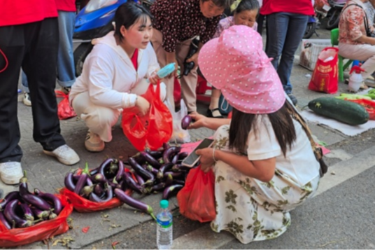 上午先锋队聚焦农产品销售环节,创新采用“线上+线下”相结合的模式助力农户增收。线上,队员们利用直播平台,向网友详细介绍大塘埠镇苦瓜、茄子的生态种植环境、品质特点及食用价值,实时解答消费者疑问,引导下单购买,有效拓宽了销售渠道;线下,队员们前往当地集市设置摊位,通过现场展示、口头推介等方式叫卖农产品,以热情周到的服务赢得了过往群众的青睐,显著提升了农产品的现场销量。