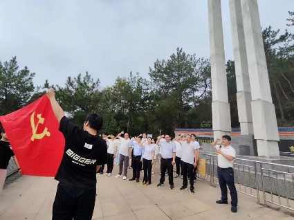 在鲜红的党旗面前,全体党员庄严地举起右拳,重温入党誓词。铮铮誓言在陵园上空久久回荡,既是对初心的坚守,也是对使命的再一次庄重承诺。瞻仰纪念碑的过程中,大家神情凝重,心潮澎湃,心灵受到了深刻的洗礼。