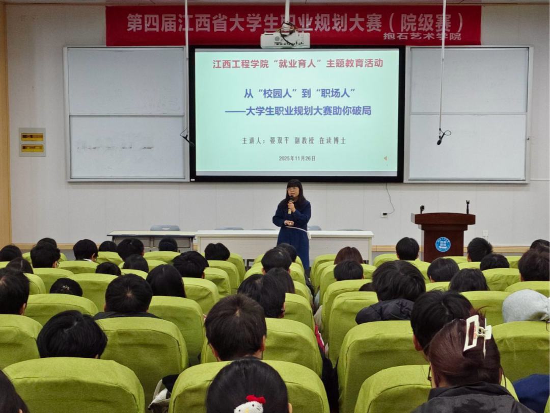 宣讲伊始,晏教授以“从‘校园人’到‘职场人’”为主题,点明了大赛“以赛促学、以赛促教、以赛促就”的核心价值。她指出,面对日益严峻的就业形势,进行科学的职业规划是每一位大学生实现高质量就业的“必修课”,而本次大赛正是帮助同学们从“迷茫”到“清晰”,主动掌控职业方向的绝佳平台。