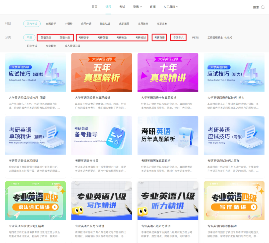新东方多媒体学习库向师生提供丰富、实用的课程,内容涵盖国内考试、出国留学、小语种、应用外语、职业认证、求职指导、实用技能七大类内容。