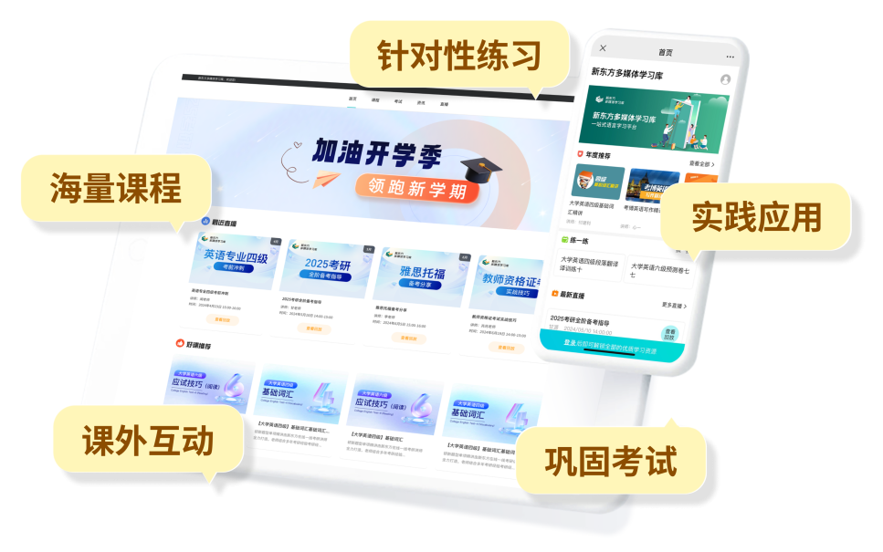 新东方多媒体学习库集课程、练习、考试、资讯、互动、实践于一体的“一站式”学习资源与服务平台。该平台提供丰富、优质的新东方培训课程,让师生感受新东方激情、幽默教学风格的同时,获得卓越的在线互动式学习体验,是考试、出国、充电、求职的优质学习资源。
