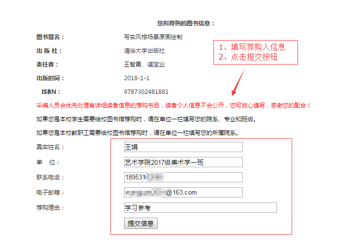 在新打开的窗口中填写荐购人信息,然后点击提交按钮即可将荐购的图书推荐给图书馆。如下图