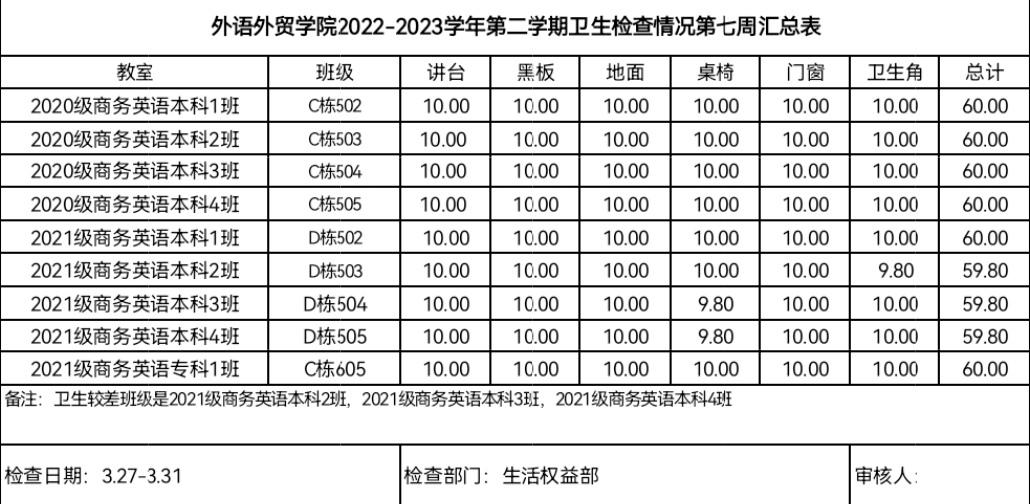 学风建设第1线 | 第7周卫生考勤情况通报汇总表