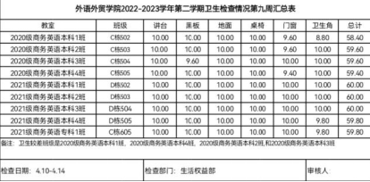 学风建设第1线 | 第9周卫生考勤情况通报汇总表