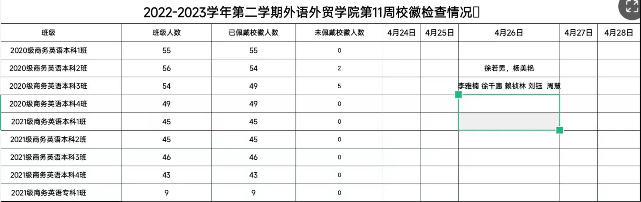 以上是我院第十一周的校徽佩戴情况。部分同学表现不是很好,校徽佩戴情况没有达到理想效果,希望大家再接再厉。为之须恒,不恒则不成。凡事要有坚韧不拔的毅力和坚持不懈的定力,一着不落地坚持下去必成大器。