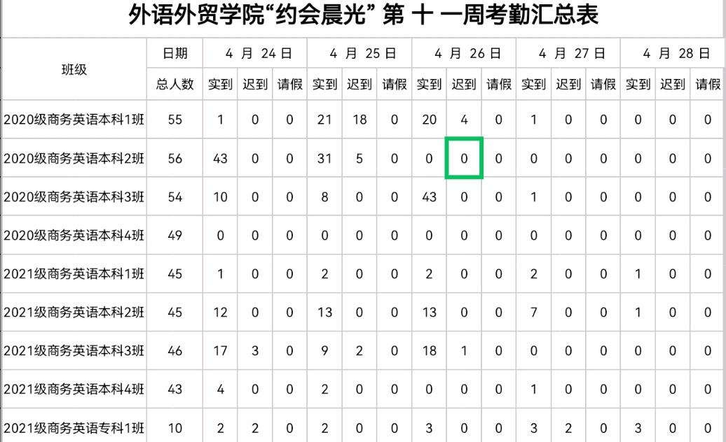 以上就是我院第十一周的卫生及早读出勤的情况。大部分班级表现很好,但还有部分班级需要加强卫生管理,卫生角和门窗的卫生需要引起重视,希望下次能有所改善。