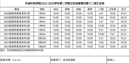 以上就是我院第十二周的卫生及早读出勤的情况。大部分班级表现很好,但还有部分班级需要加强卫生管理,卫生角和门窗的卫生需要引起重视,希望下次能有所改善。