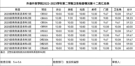 2.检查全校各班级卫生情况。配合院生活权益部,共同对学校卫生定期进行检查,并及通报改善卫生情况,使各班级保持教室整洁,营造一个良好的学习环境。
