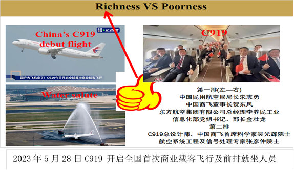 C919 首飞是我国航空事业的巨大突破,在此之前,没有国产飞机。购买一家飞机,体现不出中国的富,但是研发出国产飞机并投入使用,这是一种富,前所未有的富,航空事业的富,这种富无法用金钱衡量。同时,C919 首飞,前排坐着的顶级领导(如上图所示)来体现飞机的安全,彰显了大国领导的责任担当之富。神舟十六号载人飞船发射成功(2023年5月30日9时31分),体现中国航天之富。通过这些事件,帮助学生理解贫富的内涵,同时激发其对国家的自豪感和爱国情怀。