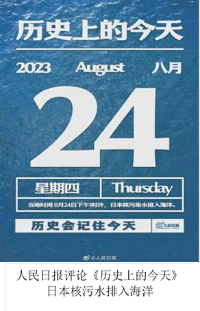 2023年8月24日,日本福岛第一核电站的核污染水排放。《人民日报》评论指出,日本政府在没有得到国际社会充分理解和信任的情况下,强行实施排污入海计划,是对国际法和国际秩序的公然践踏,是对人类共同利益和未来的严重危害。中文媒体立即坚定地反对这一行为,表达我国了对环境保护的坚定立场。