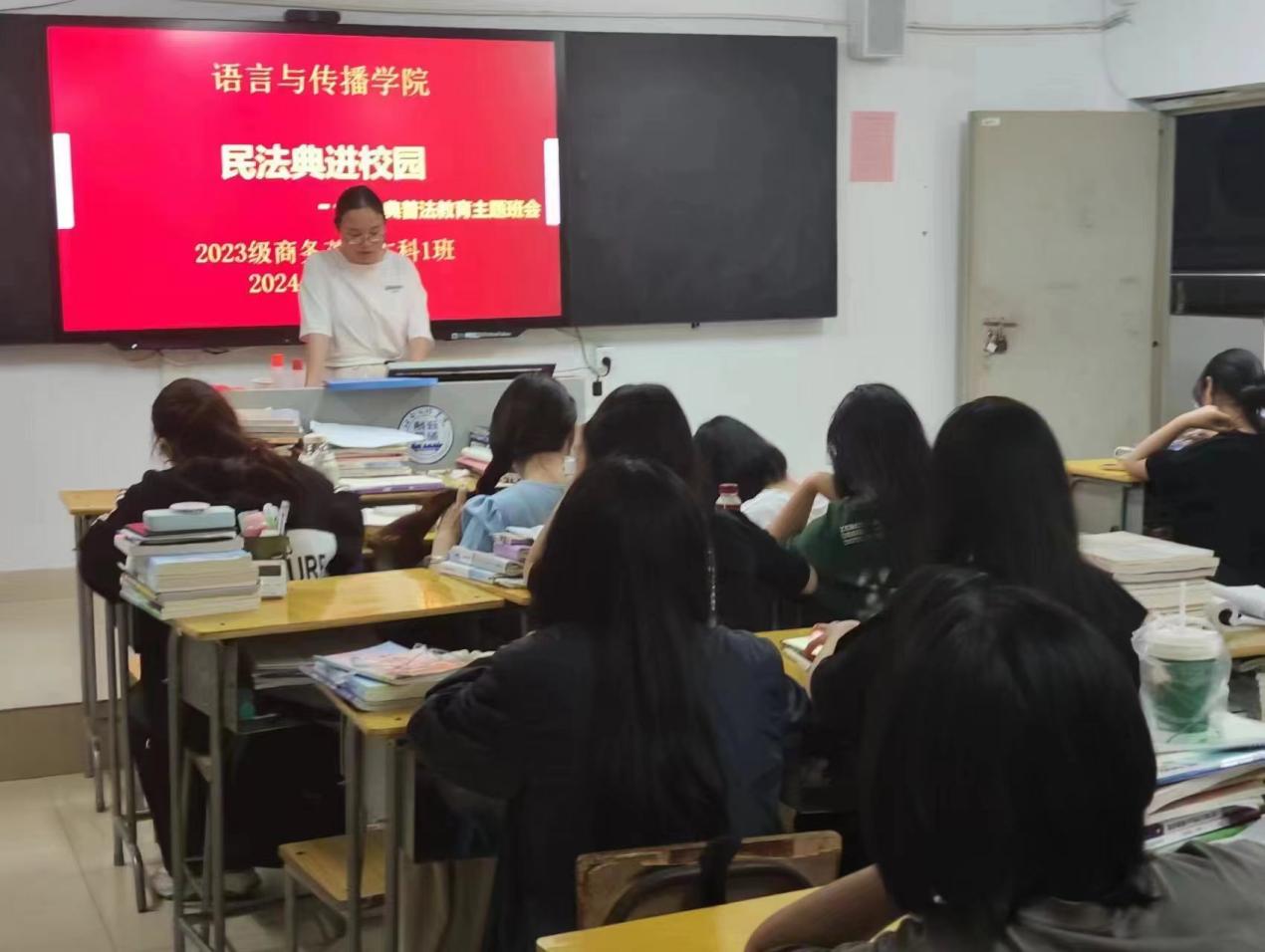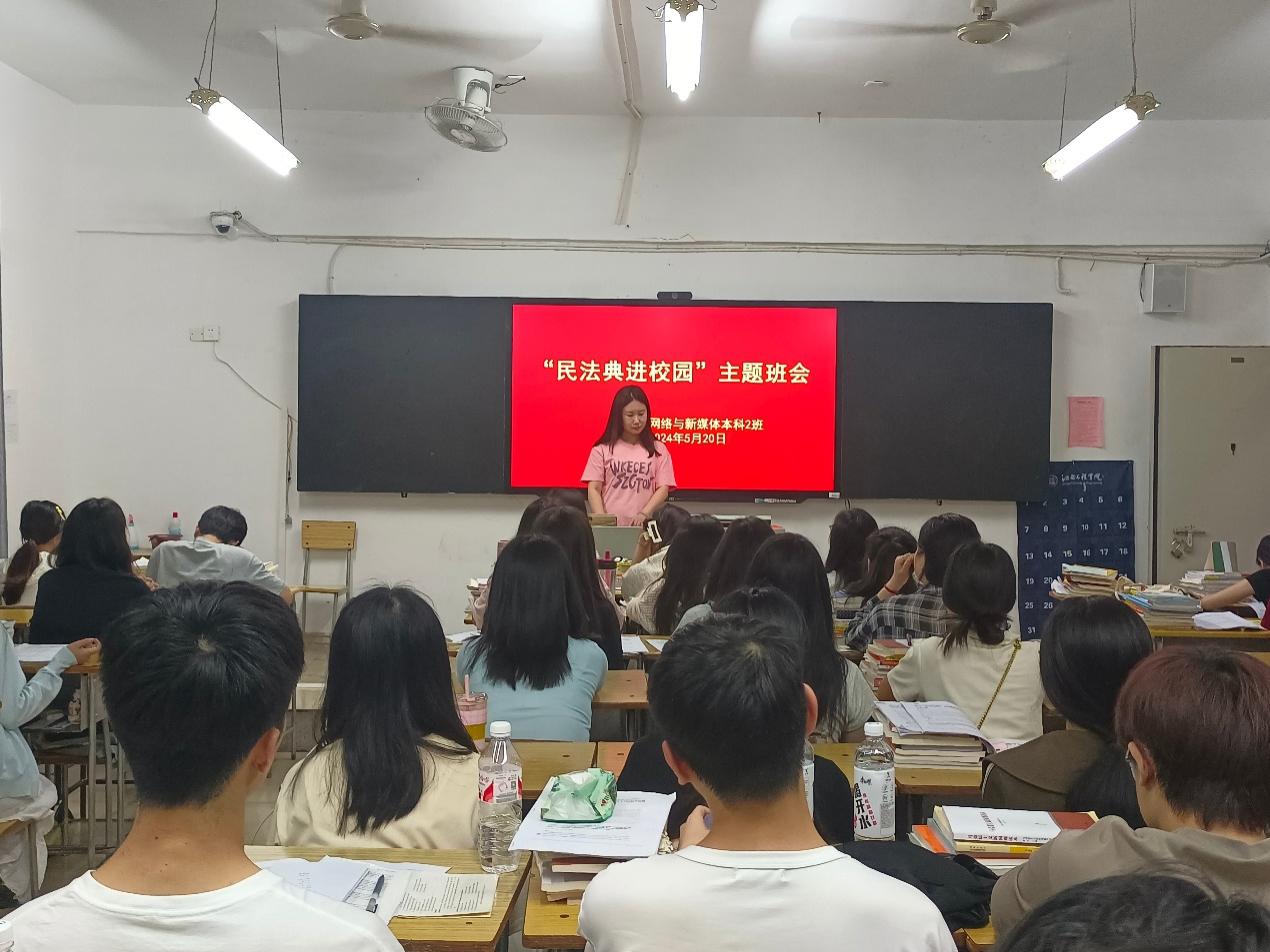 2024年5月是我国第四个“民法典宣传月”。为深入学习贯彻习近平法治思想,切实加强民法典的学习宣传教育,引导学生树立尊法、学法、守法、用法的意识,5月20日晚,语言与传播学院组织各班开展“民法典进校园”主题班会。