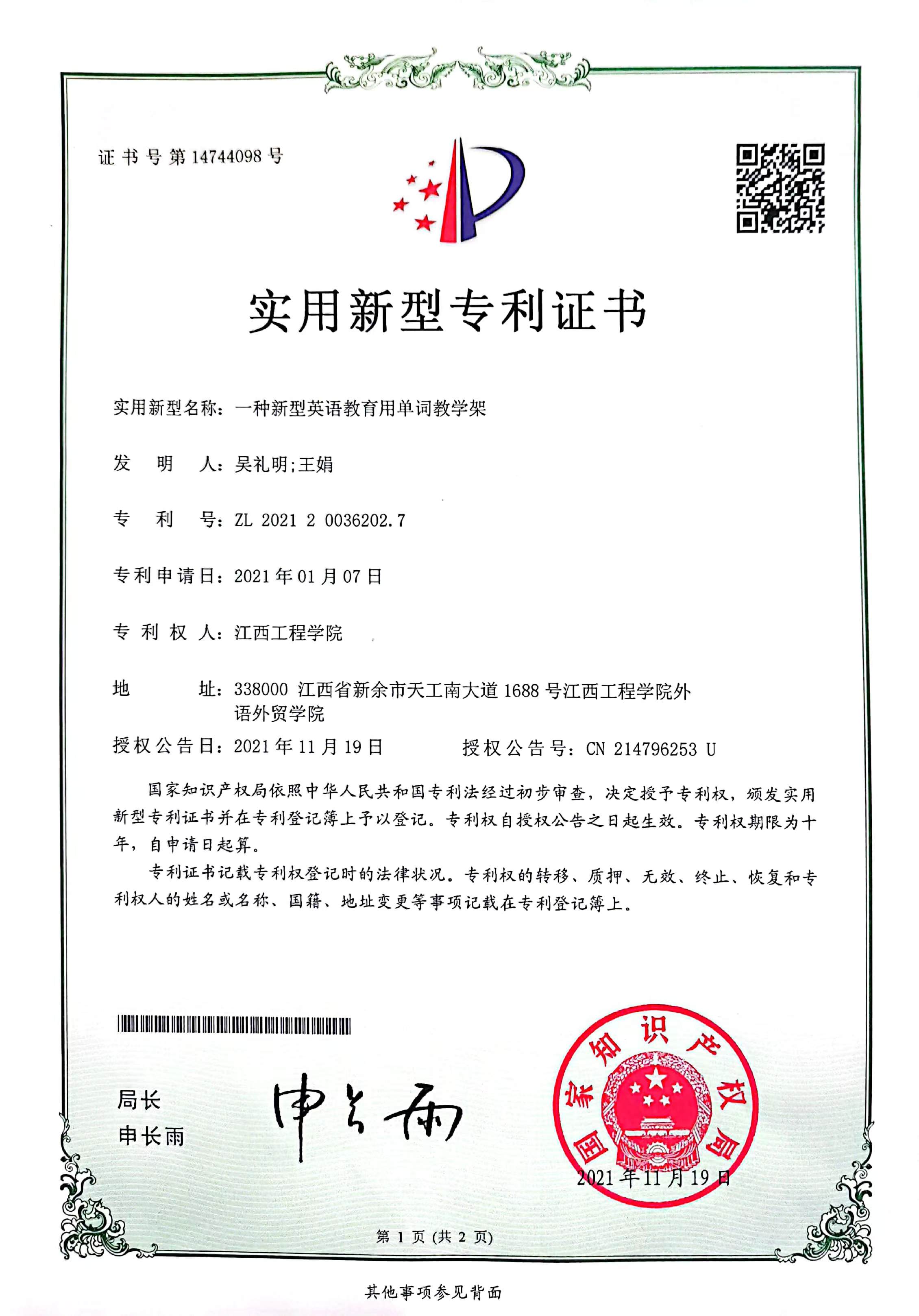 1 | 一种便携式英语教学板 | 实用新型 | ZL 2021 2 3004601.4 | 2022年4月 |