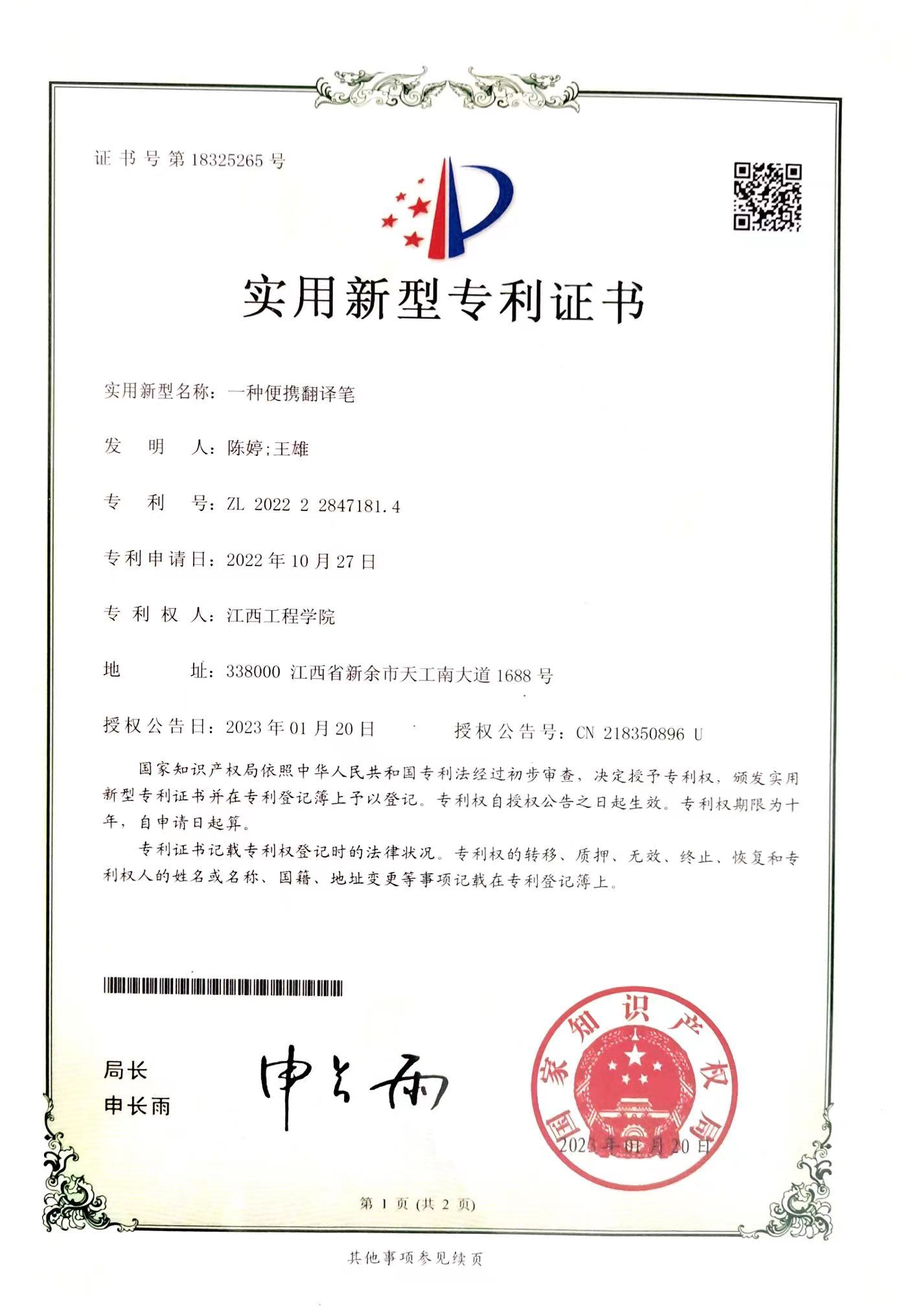 6 | 一种便携翻译笔 | 实用新型 | ZL 2022 2847181.4 | 2023年1月 |