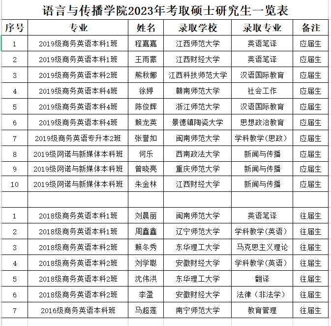 在天工文化的熏陶下,学生们都有着一种不怕吃苦、勇于挑战的精神,语言与传播学院自2020年首届商务英语本科专业共有4名同学被录取以来,目前共有近50名学生被湖南师范大学、南昌大学、福建师范大学等高校录取为硕士研究生,考研升学率逐年创新高。