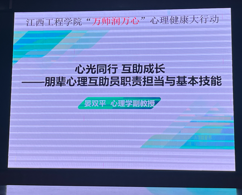 本次活动主题为“心光同行 互助成长——朋辈心理互助员职责担当与基本技能”,由心理学副教授晏双平主讲。朋辈心理互助员,是同学们身边的心灵伙伴。他们经过专业指导,将用倾听化解烦恼,以陪伴驱散阴霾。