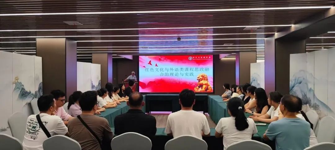 下午,圣仰芝教授带来了一场主题为“红色文化与外语类课程思政融合的理论与实践”的精彩讲座。圣教授从理论层面深入剖析了红色文化与外语课程思政融合的重要意义和基本原则,结合大量生动的教学案例,详细阐述了如何在教学中巧妙融入红色文化元素,实现知识传授与价值引领的有机统一。讲座结束后,教师们围绕“课程思政融合中的实践与挑战”展开分组研讨。大家各抒己见,分享自己在课程思政教学过程中的成功经验和遇到的问题,如如何平衡语言知识教学与思政教育的比重、怎样提高学生对课程思政内容的接受度等。通过激烈的讨论,教师们碰撞出思想的火花,找到了许多切实可行的解决方案。