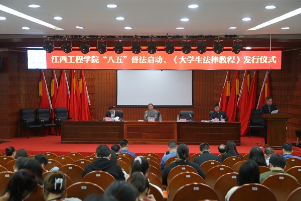 为全面贯彻落实依法治校、普及师生员工法律知识工作举措,推动我校普法宣传教育工作再上新台阶。3月10日下午,我校在天工校区学术报告厅,举行了“八五”普法启动暨《大学生法律教程》发行仪式。党委书记、督导专员胡涌,党委委员、常务副校长彭卫东,党委委员、董事长助理、校长助理乐俊杰,党委委员、校长助理邹建民出席,相关职能部门主要负责人、各基层党组织书记以及部分教师代表、学生代表共120余人参加会议。启动仪式由邹建民主持。